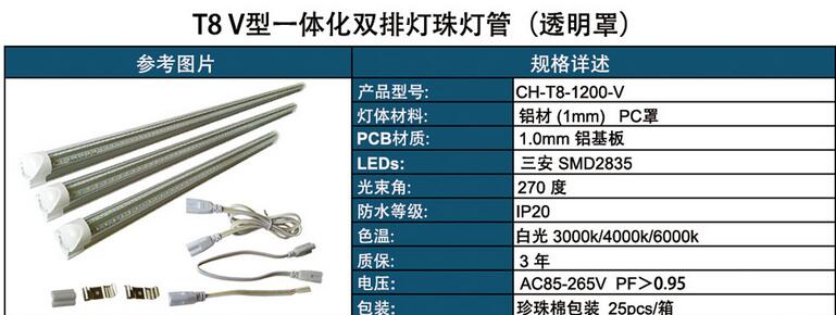 V型led燈管270度大角度發光日光燈V型led燈管270度大角度發光日光燈V型led燈管大角度發光日光燈,T8V型一體化LED燈管,發光角度270度,采用雙鋁基板,每片鋁基板有96顆燈珠,單電源供電,單端或雙端通電。高壓 85-305v或低壓 24-36v供電,質保3年。
