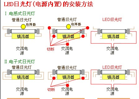 2、取下傳統日光管支架里的整流器(建議),去掉支架上的起輝器(必須),把LED管裝上支架即可。