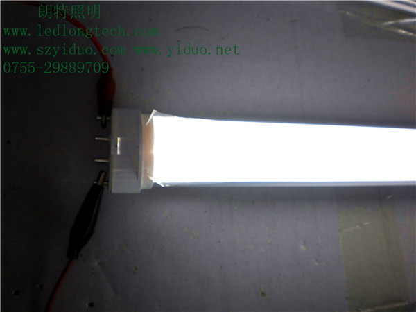 2G11led燈管一般采用鋁合金+PC燈罩來做,由于鋁合金外殼體積較大,遠大于普通led日光燈管外殼,里面鋁槽較寬,一方面功率可以做的更加大些,一方面要采用兩張鋁基板或一張寬鋁基板來做,目的是讓led燈珠在鋁槽里鋪的均勻,不至于在透過PC燈罩是導致發光不均勻,看見燈珠分散發光,就是我們通常所說的LED光斑。堵頭比較大,但接線和普通led日光燈也有不同,沒兩根針為聯通的,輸入零線和火線即可以點亮。目前0.45米功率做到18w,普通燈管只能做到9w,0.6米做到36w,功率遠遠大于普通日光燈,可以做大功率、高光通量的燈管。